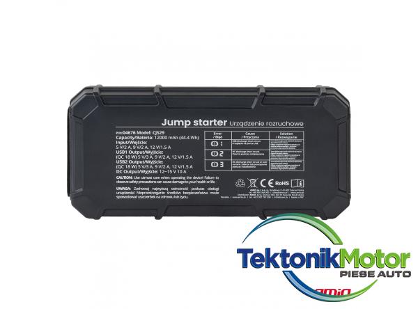 Starterul AMiO 3 în 1 este un dispozitiv modern si eficient care combina functiile unui starter, ale unei power bank-uri si ale unei lanterne LED. Echipat cu un afisaj LCD clar, ofera control deplin asupra functionarii dispozitivului si a starii de încarcare. Datorita capacitatii mari a bateriei si curentului de pornire ridicat, este ideal pentru aplicatii profesionale si utilizarea zilnica de catre soferi.Specificatii tehnice: