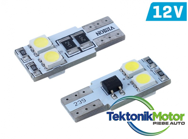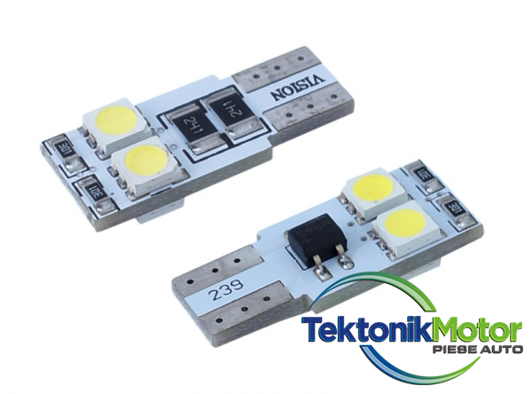 Sursa de lumina este de 4 LED-uri SMD 5050. Culoarea luminii alb (6000K). Tensiunea este de 12V. Consum de energie: 1,6 W.În plus, echipat cu un modul CANBUS, datorita acestui bec LED nu provoaca eroarea unui bec ars pe computerul din masina.