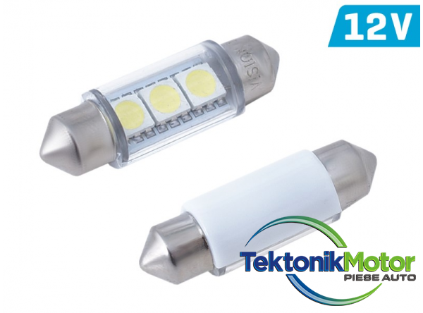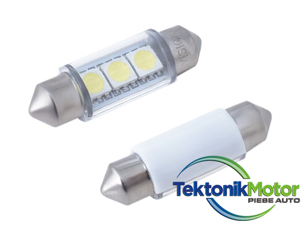 Sursa de lumina este de 3 LED-uri SMD 5050. Culoare deschisa alb. Tensiunea este de 12V. Consum de energie: 1W. Lungime 36 mm.Becurile vor fi folosite pentru a ilumina interiorul vehiculului, portbagaj si placute de inmatriculare.