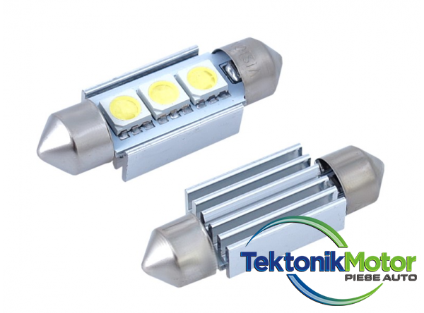 Sursa de lumina este de 3 LED-uri SMD 5050. Culoare deschisa alb. Tensiunea este de 12V. Consum de energie: 1W. Lungime 36 mm.Echipat suplimentar cu un modul CANBUS, datorita caruia becurile LED nu provoaca eroarea unui bec ars pe computerul din masina.