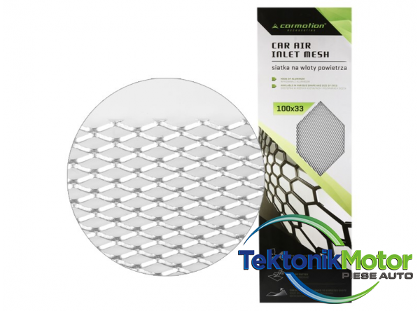 Plasa de tuning argintie din aluminiu. Este ideal pentru instalarea în partea din fata a caroseriei masinii. Va oferi fiecarei masini un caracter mai deosebit, mai agresiv. Ochi în forma de diamant de 7x12 mm.Dimensiuni foi: 100x33 cm