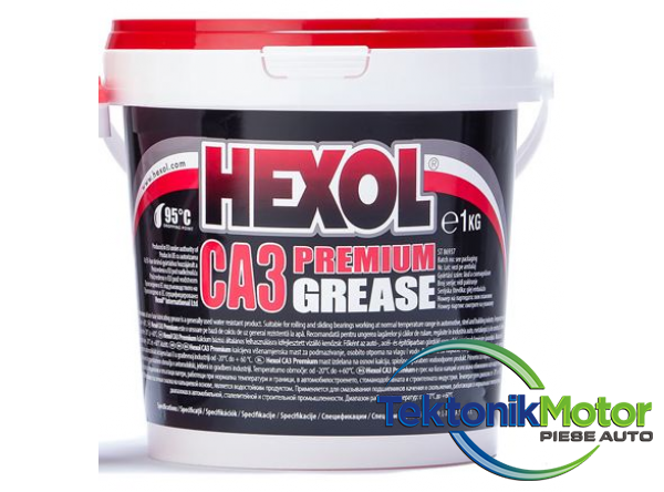 Hexol Ca3 Premium este o unsoare pe baza de calciu de uz general rezistenta la apa. Recomandata pentru ungerea lagarelor si cailor de rulare, regasite în industria auto, metalurgica si de constructii. Interval termic cuprins între -20°C si +60°C. Specificatii si agreari: ISO 6743-9: L-XBAHA 3; NLGI-3.Masini aferente
